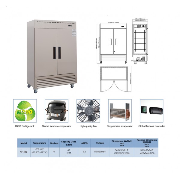 This 2 solid door 49 cu.ft freezer is designed specially for restaurants, bars, shops and Residential with both exterior and interior stainless steel, and exterior stainless steel is designed with anti-fingerprint function. Ensure longer life and easier cleaning work.