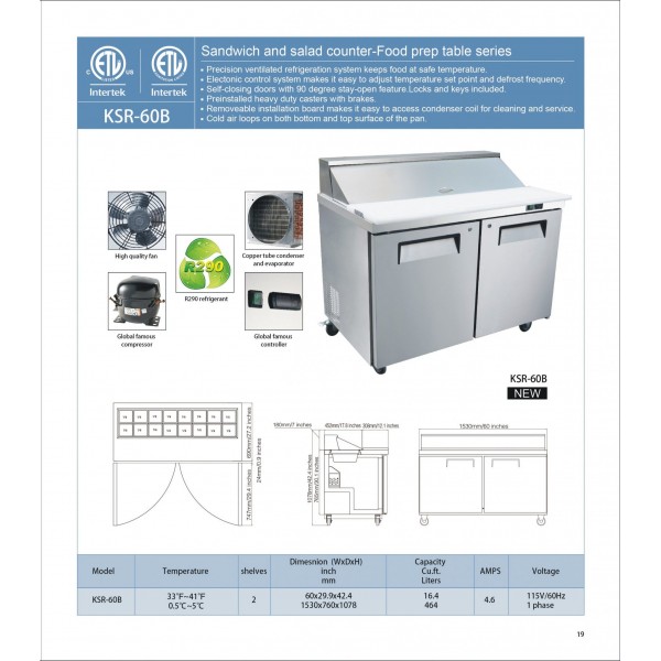 Eqchen KSR-60B, Commercial 60" 16 Pan Salad Sandwich Food Prep Table Refrigerator