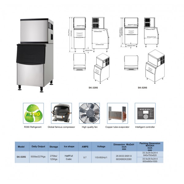 2.Ice making capacity: 500lbs/227Kgs/24hours, Ambient temperature 70℉, water temperature 50℉